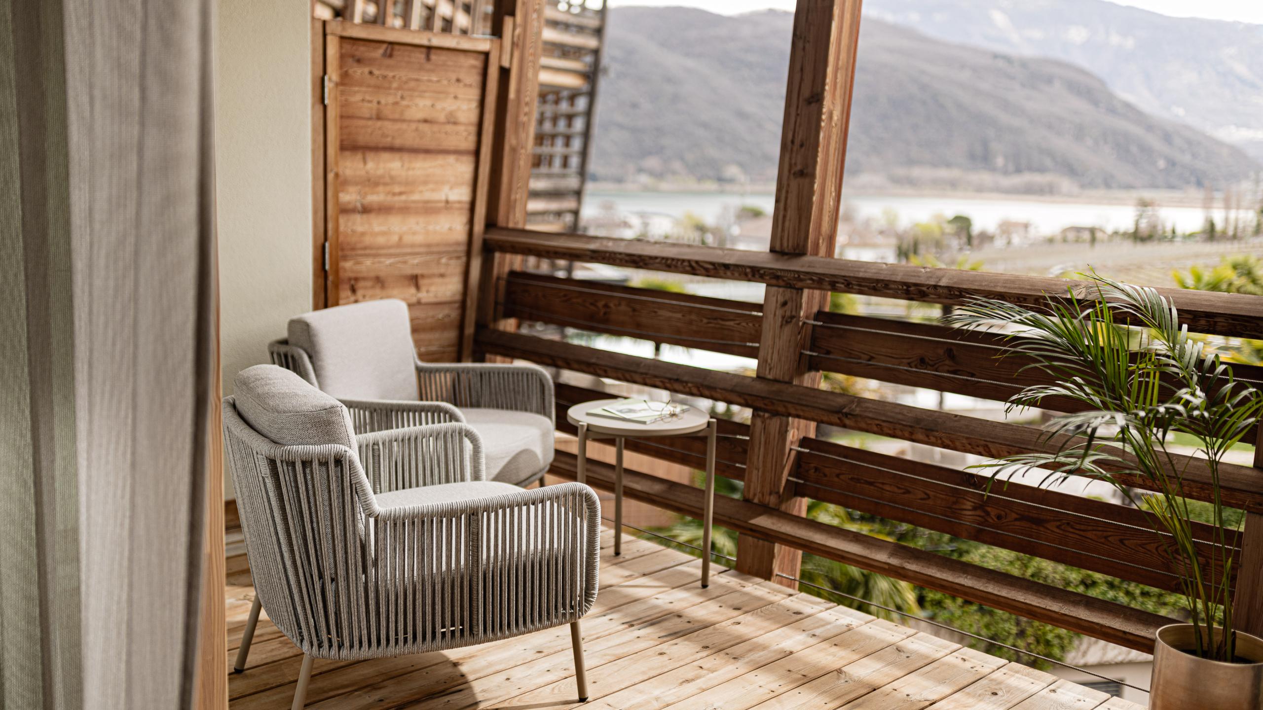 - Balcony with designer furniture and views over the Mediterranean garden to Lake Caldaro with Mitterberg and Castel Leuchtenburg – or to the surrounding vineyards