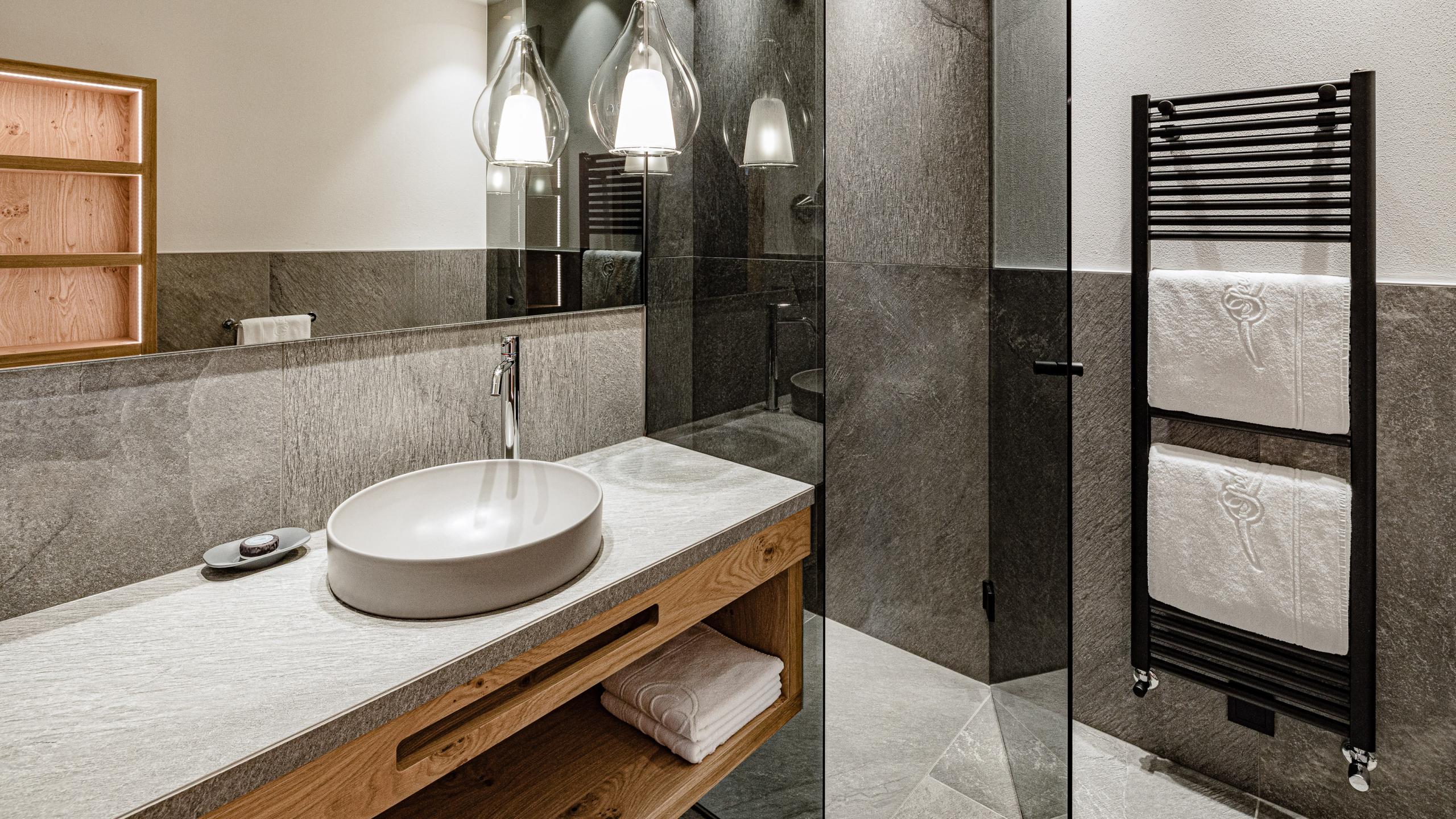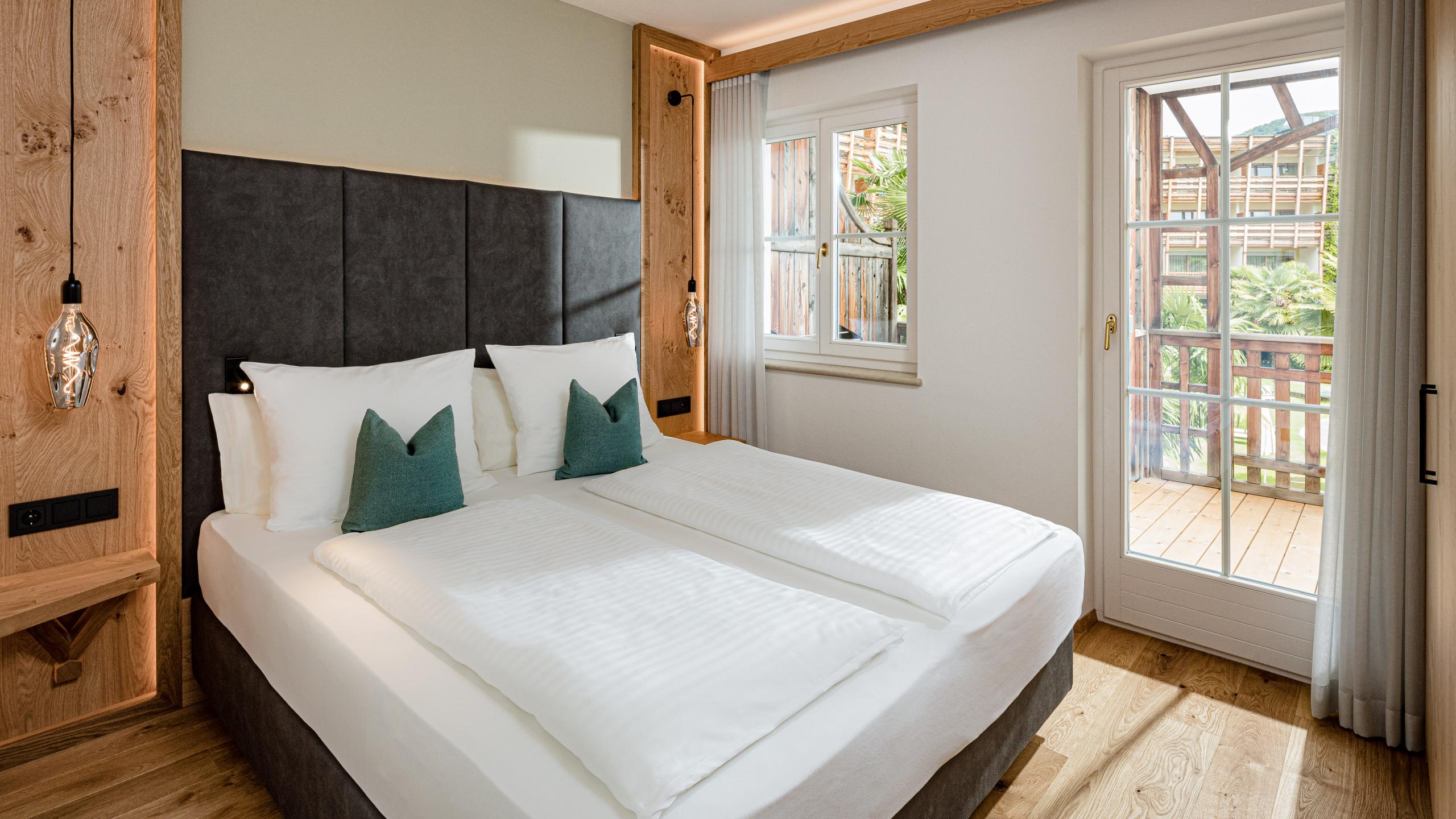 Inside: two stylish bedrooms with boxspring beds. A separate living room for reading and relaxing. Two bathrooms, two balconies – freedom and flow. Precious wooden flooring underfoot, custom-made oak furniture throughout. Thoughtfully designed. Comfortably refined. The style? Depending on the suite: soft and friendly, or bold and elegant.