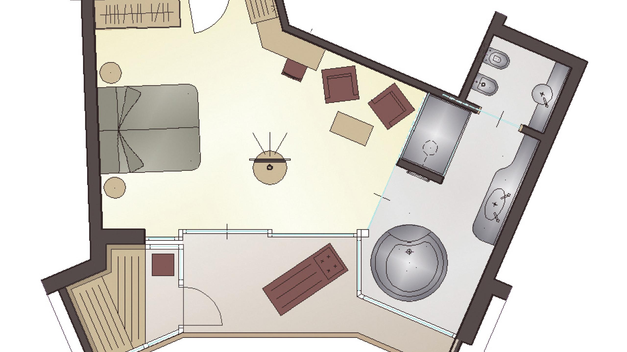 Eine Whirlwanne mitten im Raum. Zwei Loungesessel, so weich wie ein Versprechen. Und Ihre private Sauna unter freiem Himmel – finnisch oder sanft mit Infrarot. Für Momente, die länger bleiben als der Aufenthalt.